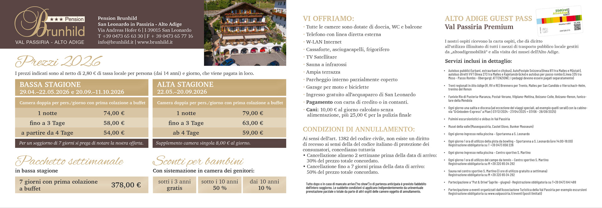 • Dal 01.01.2014 si aggiunge l`imposta comunale di soggiorno al prezzo indicato. L`importo dell`imposta è di Euro 2,80 per giorno e persona (a partire da 14 anni).