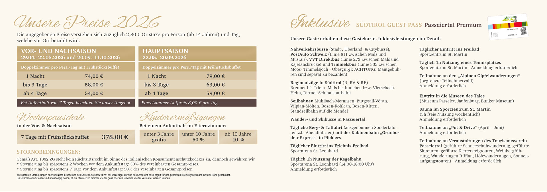 Unsere Gäste erhalten diese Gästekarte, die zur freien Nutzung des gesamten öffentlichen Personennahverkehrs von „südtirolmobil“ in Südtirol berechtigt und viele weitere Inklusivleistungen bietet.
